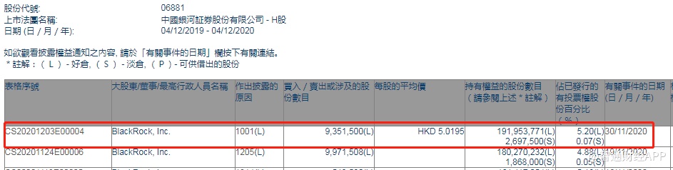智通财经APP获悉,香港联交所最新资料显示,11月30日,贝莱德增持中国银河(06881)935.15万股,每股作价5.0195港元,总金额约为4693.99万港元。增持后最新持股数目约为1.92亿股,最新持股比例为5.20%。