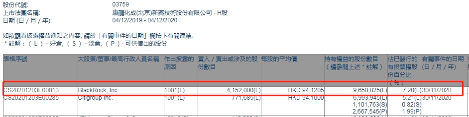 智通财经APP获悉,香港联交所最新资料显示,11月30日,贝莱德增持康龙化成(03759)415.2万股,每股作价94.1205港元,总金额约为3.91亿港元。增持后最新持股数目约为965.08万股,最新持股比例为7.20%。