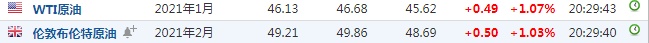 截至发稿,WTI原油涨1.07%,报46.13美元/桶。布伦特原油涨1.03%,报49.21美元/桶。