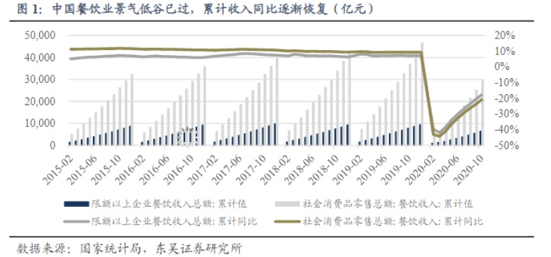 不过,单单把火锅类股票上涨归功到“吃货力量”上,未免有点过于偏颇。随着10月餐饮增速首次转正这一利好消息的释出,餐饮行业似乎已逐渐走出公共卫生事件的“黑暗时刻”,而这会是支撑火锅股股价往上走的主要原因吗?