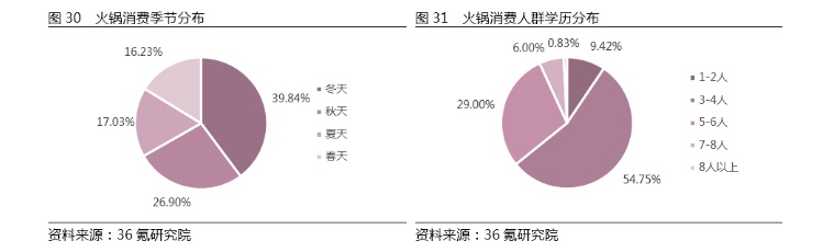 从季节上看,气温较为寒冷的秋冬季节,火锅消费需求更大,而春夏季的消费比例相近,春季略低于夏季。这侧面说明虽然火锅的需求很大程度上受到气温的影响,消费者普遍喜欢在气温下行时消费火锅。而从就餐人数看,消费者比较偏好小桌就餐,人数一般都在6人及以下,而54.75%的消费者在消费火锅时,都是在3-4人的范围内。