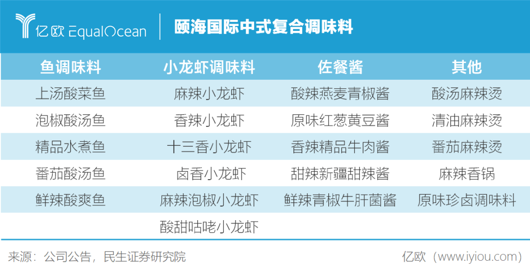 颐海国际在中式复合调料市场进行全面开花,产品线覆盖鱼系列调味料、小龙虾系列调味料、佐餐酱等多种类别。