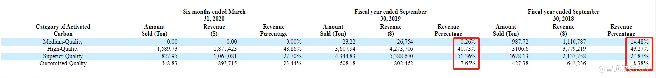 据招股书显示,2019财年时,中北能的活性炭产品主要为高质量和超高质量两种,二者的比例分别为40.73%、51.36%,合计超90%,剩余7.65%为定制质量,中等质量产品占比仅0.26%。反观2018财年,中等质量产品的收入占比为14.48%,而高质量与超高质量两大产品的占比分别为49.27%、27.87%,合计77.14%,较2019财年时低近13个百分点。此外,定制质量产品占比为8.38%。