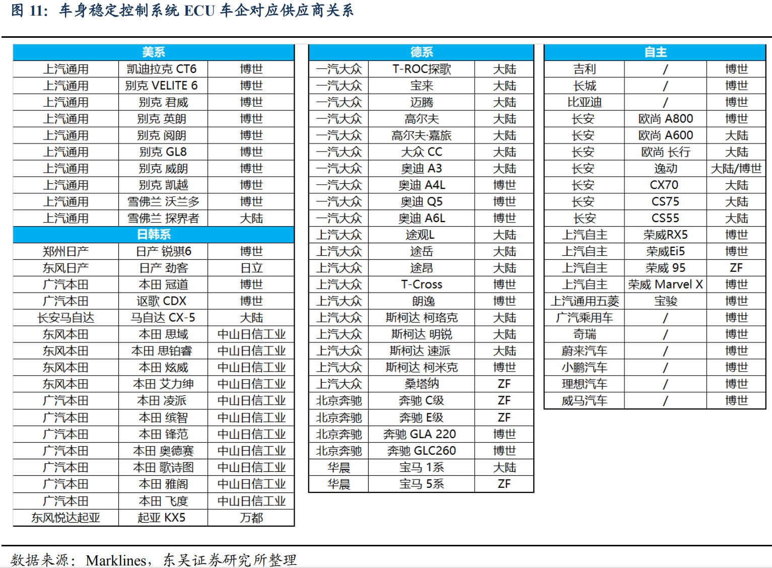 根据Marklines统计,一般美系多采用博世;日韩系除博世、大陆外,多采用日资背景的零部件企业如中山日信工业、日立、万都;德系多采用博世、大陆、ZF;国内自主品牌多采用博世、大陆。