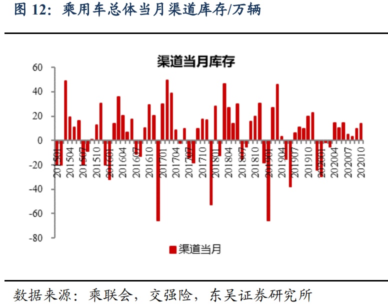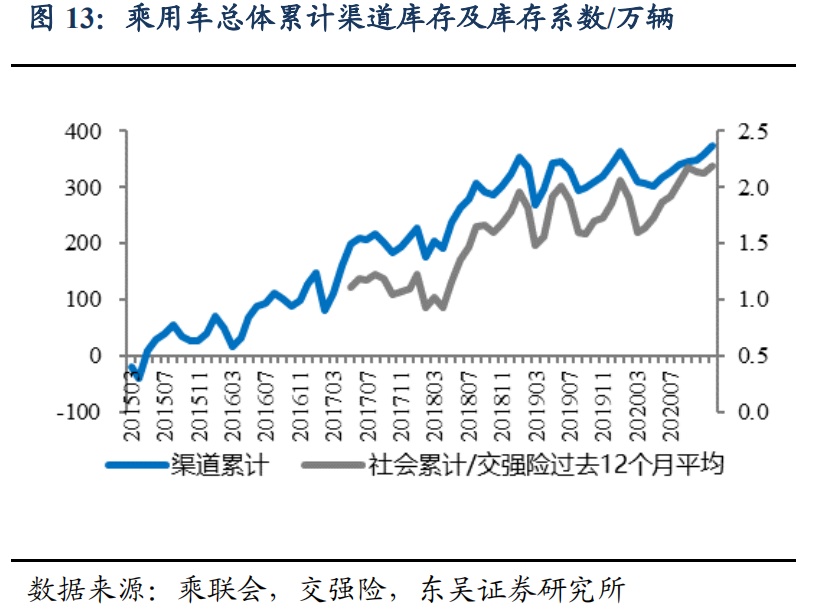 受上游车用芯片供给紧张,短期对下游车企的排产带来一些扰动,但行业总体渠道库存可以形成较好的对冲。根据我们自建渠道库存数据库体系(行业2015年初开始),乘用车行业渠道库存累计373万辆,库存系数2.2个月。企业库存层面根据我们测算,分为两类:1)累计库存较多:上汽大众、上汽自主、吉利汽车、一汽大众、广汽自主、上汽通用。2)累计库存较少:长城汽车、长安汽车、比亚迪,日系车企(丰田/本田/日产),长安福特,豪华车(奔驰+宝马)。