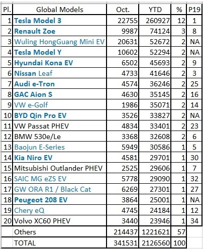 智通财经APP获悉,12月6日,根据电动车市场机构EV Sales Blog发布的相关数据显示,十月份全球电动汽车销量中,特斯拉(TSLA.US) Model 3以26.1万辆的月销数据高居榜首,雷诺佐伊 (Zoe)以7.41万辆的数据位列次席。特斯拉Model Y、奥迪e-Tron以及比亚迪(01211)秦系列分居该榜第4、第7以及第10位。