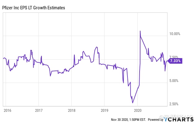总而言之,分析师们预测,从长期来看,辉瑞公司的每股收益将能以每年7%的速度增长。这一估计数与过去的估计数相当: