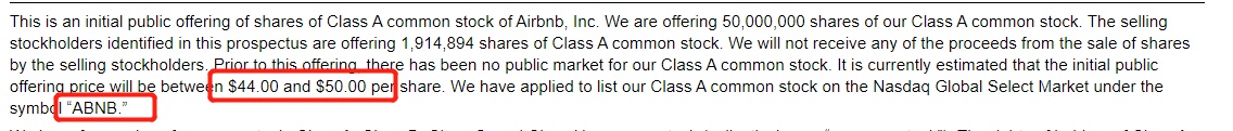 11月17日,Airbnb向美国证券交易委员会(SEC)提交了IPO上市申请,美股上市代码“ABNB”。公司估值区间在300-330亿之间,高于市场预期。据招股书,公司初始公开募股价格发行区间定在每股44元至50美元之间。以47美元的中间值计算,公司有望通过IPO上市融资23亿美元;如果承销商选择行权购买额外350万股,那么公司至多可融资25亿美元。