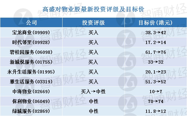 高盛将中海物业(02669)评级由“买入”降至“中性”,目标价下调30%至7港元,并重申对宝龙商业(09909)、时代邻里(09928)、碧桂园服务(06098)、新城悦服务(01755)、永升生活服务(01995)及雅生活服务(03319)“买入”评级。