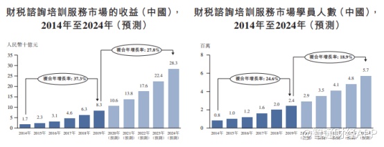 数据显示,2014-2019年,财税咨询培训服务市场的总收益由17亿元增加至83亿元,复合年增长率约为37.3%,并预期于2024年将达到283亿元,复合年增长率约为27.8%;而参与财税咨询培训的学员人数则由2014年的80万人增加至2019年的240万人,复合年增长率约24.6%,并预计于2024年达到570万人,复合年增长率约为18.9%。