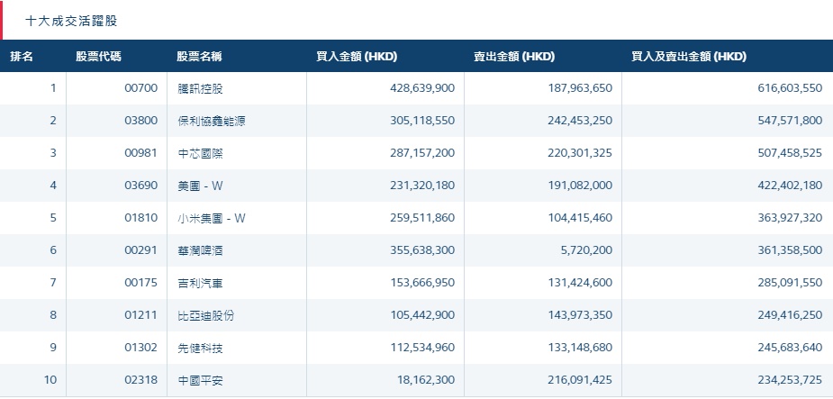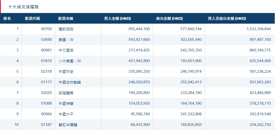 此外,腾讯(00700)获净买入6.18亿港元。而中芯国际(00981)、华虹半导体(01347)、先健科技(01302)分别遭净卖出1.58亿、8539万、2061万港元。