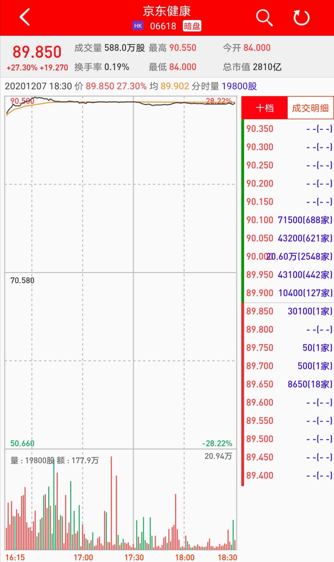 智通财经APP获悉,京东健康(06618)将于12月8日在香港挂牌,截至暗盘收盘,利弗莫尔证券资料显示其暗盘报价89.85港元,较招股价70.58港元涨27.3%。每手50股,不计手续费,每手赚963.5港元。
