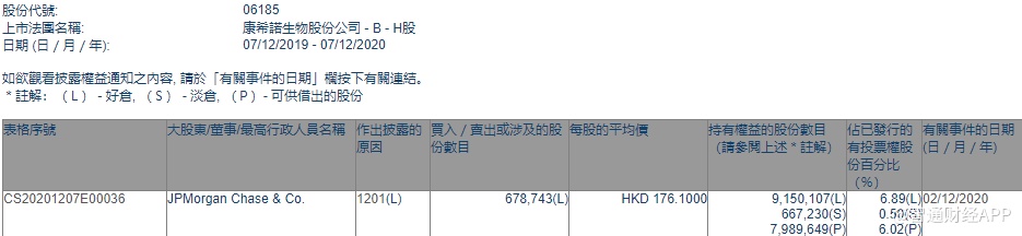 智通财经APP获悉,香港联交所最新资料显示,12月2日,摩根大通减持康希诺生物-B(06185)67.8743万股,每股作价176.1港元,总金额约为1.195亿港元。减持后最新持股数目约为915.01万股,最新持股比例为6.89%。