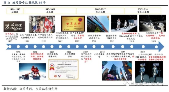 44年历史,历经四个发展期:①初创期(1976-1995),波司登创始于1976年,最初以羽绒服贴牌加工为主,于1994年成立波司登品牌。②成长期(1995-2007),1995 年以来波司登羽绒服销量连续25年居全国第一,并针对不同消费人群相继推出雪中飞、康博、冰洁三款羽绒服;2007获得“世界名牌”称号,同年在香港主板上市。③多元化期(2007-2017),公司积极发展四季化战略,进入男装领域、扩充女装业务,同时也经历渠道扩展过快、库存积压与电商冲击阵痛期。④重返主业期(2017-至今),面对品牌老化、时尚度缺乏等问题,公司17年提出“聚焦主航道,收缩多元化”战略,升级品牌力、产品力、渠道力,做强羽绒核心主业,打造中高端羽绒服品牌。