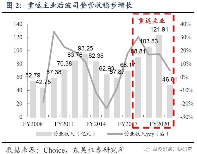 波司登是国产羽绒服领军企业,拥有四大业务八大品牌。1)羽绒服业务:专注于羽绒服研发、设计与制作,拥有波司登、雪中飞、冰洁等品牌。羽绒服业务是波司登的主要收入来源和增长驱动,FY2020羽绒服业务收入95.13亿元,同比增长24.23%,占总收入78%。2)贴牌加工业务:规划利用淡季羽绒服产能,为国内和国外的客户提供贴牌加工管理业务,FY2020收入为16.11亿元,占比达13.22%。3)女装业务,由2011-17年间收购的杰西、邦宝、柯利亚诺及柯罗芭品牌构成, FY2020收入占总8.06%。4)多元化服装业务,在采取“聚焦主航道,收缩多元化”战略后,多元化服装业务逐步收缩,家居/男装全面缩减,该业务板块现主打飒美特校服与童装。