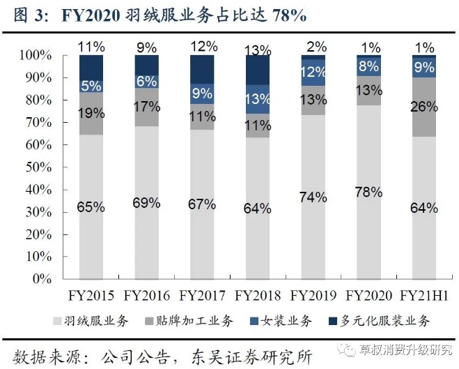 重返主业后营收稳步增长,羽绒服业务占比逐年提升。公司2016-17年完成去库存后,提出“聚焦主航道,收缩多元化”战略,聚焦羽绒服业务,加强羽绒服产品、渠道及营销升级。FY2018改革开始后羽绒服业务收入占比持续提升,在羽绒服业务的拉动下公司业绩加速增长,改革收效显著。FY2021H1公司收入46.61亿元,同比增长5.1%。