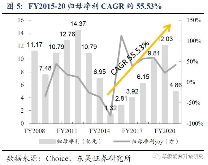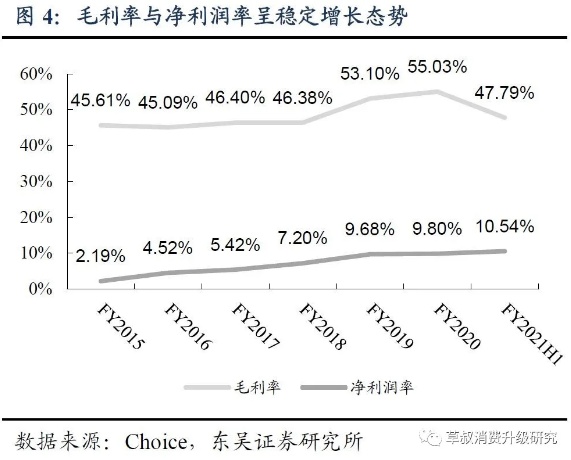 毛利率与净利率稳定提升,归母净利持续增长。2018年以来公司致力于品牌升级,产品售价得到提升,因此毛利率与净利率实现逐年增长。FY2020公司毛利率为55.03%,同比增长1.93pct;净利率为9.80%,同比增长0.12pct。在经营边际的不断改善下,近年公司利润持续高增,FY2020公司实现归母净利润12.03亿元,同比增长22.61%,进5个财年CAGR为55.53%;FY2021H1归母净利达4.86亿元,同比增长41.84%。