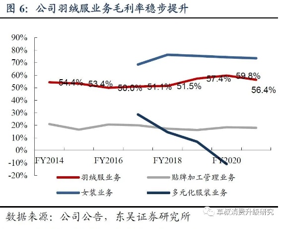 羽绒服业务毛利率逐年提升,未来仍可进一步提升公司整体毛利率。就公司单项业务来看,2018年重新聚焦羽绒服主业后不断升级品牌、提高售价,羽绒服业务毛利率明显提升,FY2020毛利率达59.8%(同比+2.4pct)。