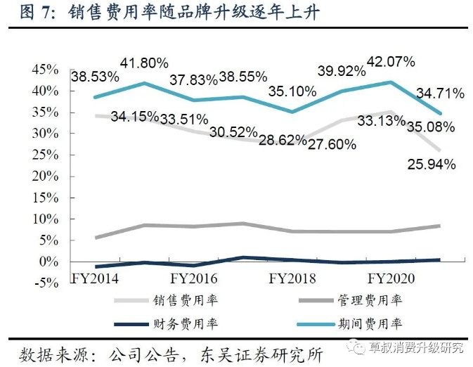 销售费用率随公司加大营销力度而上升,管理费用率及财务费用率保持稳定。公司于2018年进入“重返主业期”后持续加强品牌营销力度,通过与媒体、直播带货主播合作,举办新品时装秀、邀请高流量明星代言等方式加强公司品牌影响力。这导致销售费用率增长明显,FY2020销售费用率为35.08%,同比+1.95pct。