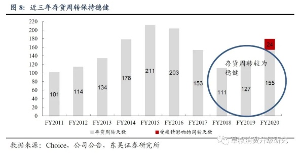 库存管理不断优化,库存水平有望维持稳健。1)公司通过严格执行生产和产品规划,保持全部区域通过拉式补货实现产销结合;2)加强实时对终端零售数据的抓取及分析,根据汇总的销售等数据调整与渠道及终端的互动,优化整体库存管理;3)不断推动零售精细化管理,提升整体运营效率。公司于2016、2017年进入清库存尾期,FY2018存货周转天数为111天、FY2019为127天,FY2020库存周转天数受卫生事件影响约24天,总体来说,公司库存管理水平保持稳健。