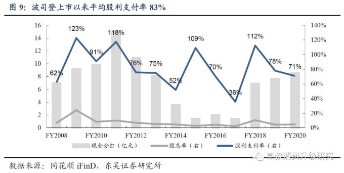 股利支付率平均高达83%,彰显公司重视股东回报。公司自上市以来维持较高股利支付率,平均支付率达83%。2017年库存清理尾期及聚焦羽绒业务伊始期,股利支付率处于低位,为36%;2018年重返主航道后,波司登品牌持续升级,股利支付率得以恢复,平均支付率为 82.53%。FY2020公司现金分红8.53亿元,分红率达71%,自上市以来累计分红91.39亿元。