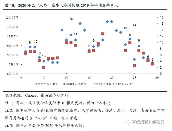20年降温来得早,9月底气温普降,迎“早冬”。我们选取全国所有省份的省会城市进行气温比较,剔除了青海、海南、香港、澳门、台湾,共选取29个城市。挑选的省会城市,以日最低温低于10摄氏度作为“入冬”标志。据Choice数据,2020年北京、天津、石家庄、济南、郑州、贵阳、西安等城市在国庆假期结束前已“入冬”,以上29个城市中已入冬城市入冬时间平均比19年提早9天。