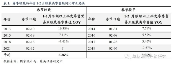 回顾往年,春节较晚的年份,1-2月服装卖得更好。我们以2月10日作为分界点,分成两个组别:①“春节较早”组,春节在2月10日之前,则春节假期通常在2月15日前结束;②“春节较晚”组,春节在2月10日之后,春节假期通常在2月15日后结束,冬装消费辐射到2月下旬。我们统计了2013-2019年的春节日期及限额以上企业(单位)服装类零售数据,其中,“春节较晚”组1-2月增速为6.36%,较“春节较早”组高2.79pct。2021年春节日期为2月12日,属于“春节较晚”组别,从往年经验来看,1-2月服装类产品有望实现较高的销售额。