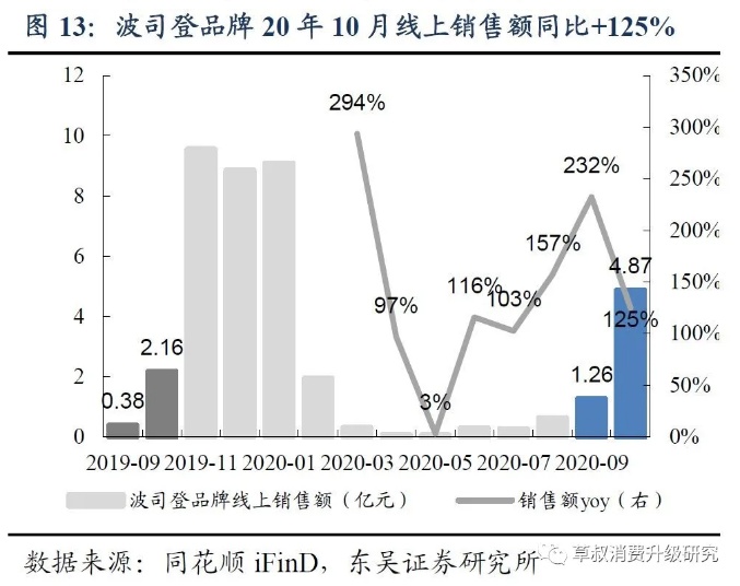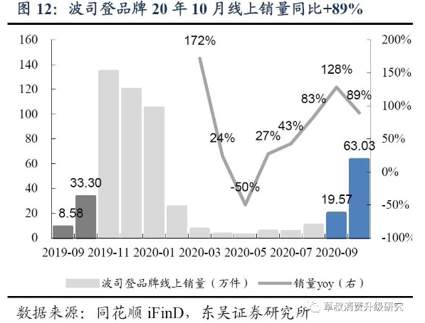 具体来看,波司登品牌2020年线上销售自8月以来保持强劲增长,20年冬季消费有望高增。羽绒服消费周期一般从每年的10月份(国庆档)-次年的2月份(春节档),但2020年春节较早(1月25日),春节档辐射到2月中旬左右,叠加2020年1月-3月卫生事件影响,波司登品牌羽绒服2、3月份销量较低。而卫生事件后,线上、线下销售逐渐恢复,波司登品牌9月/10月线上销量同比+128%/89%,销售额同比+232%/125%,“双11”期间同比+25%以上,增长态势强劲,随着下半财年(10月1日-3月31日)专业保暖系列等更多新品的推出,预计20年整个冬季能保持较快增长。