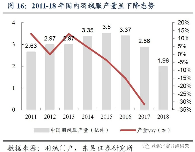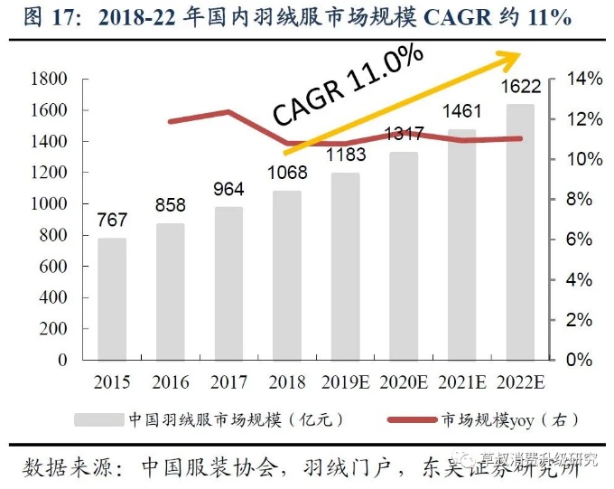 (1)从羽绒服产量来看, 2011-15年国内羽绒服产量逐年增加,15年产量达3.5亿件。15年后由于环保趋严导致部分小厂关闭,产量呈下降态势,2018年产量降至1.96亿件。(2)从销售额来看,国内服装消费市场庞大,且市场规模逐渐扩大,国外服装品牌纷纷进军我国,2018年国内羽绒服市场规模约1068亿元,同比增长10.79%,据中国服装协会预计,2022年国内羽绒服市场规模将达1622亿元,2018-22年CAGR约11%。