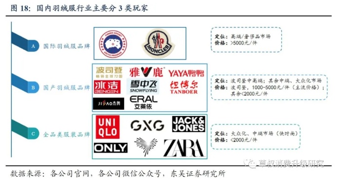 1)国际羽绒服品牌以Ganada Goose、Moncler为主,价格5000元以上,定位高端市场。
