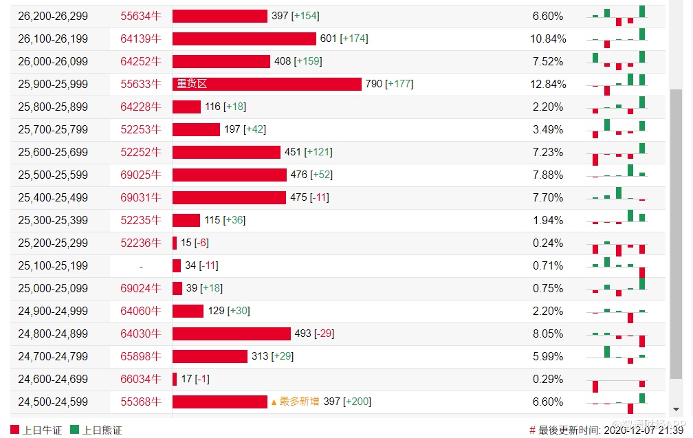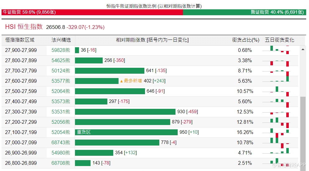 智通财经APP获悉,截至12月7日,恒指最新的牛熊街货比例60:40。法兴恒指牛熊证街货分布图中的数据显示,熊证街货重货区在27100-27199区间,该区间最新熊证数量为950张,较上一交易日增加10张。最多新增在27600-27699区间,该区间最新熊证数量为402张,较上一交易日增加243张。牛证街货重货区在25900-25999区间,该区间最新牛证数量为790张,较上一交易日增加177张。最多新增在24500-24599区间,该区间最新牛证数量为397张,较上一交易日增加200张。