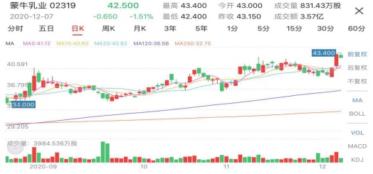 正如蒙牛近几年每年的股价表现,不显山不漏水,但以5年为周期,公司股价从2014年收盘的11.82港元,到2020年12月4日创下43.4港元历史新高,期间最高涨幅达到约267%,领先行业。即便在2020年这样特殊的年份,蒙牛仍有最高近4成的股价涨幅。
