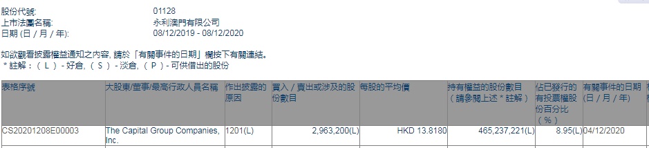 智通财经APP获悉,香港联交所最新资料显示,12月4日,美国资本集团减持永利澳门(01128)296.32万股,每股作价13.818港元,总金额约为4094.55万港元。减持后最新持股数目约为4.65亿股,最新持股比例为8.95%。