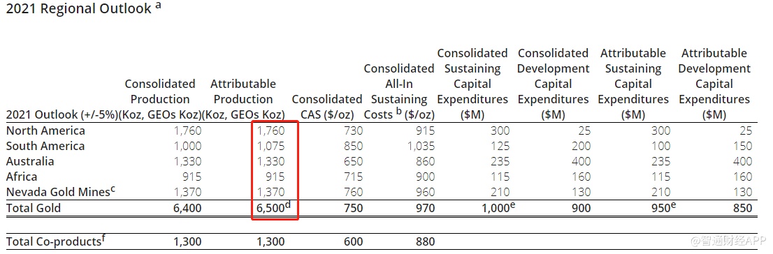 该公司预计,2021年黄金产量为650万盎司,其中,北美洲黄金产量为176万盎司,南美洲黄金产量为107.5万盎司,澳大利亚黄金产量为133万盎司,非洲黄金产量为91.5万盎司,内华达金矿黄金产量为137万盎司。总维持成本(AISC)为970美元/盎司。