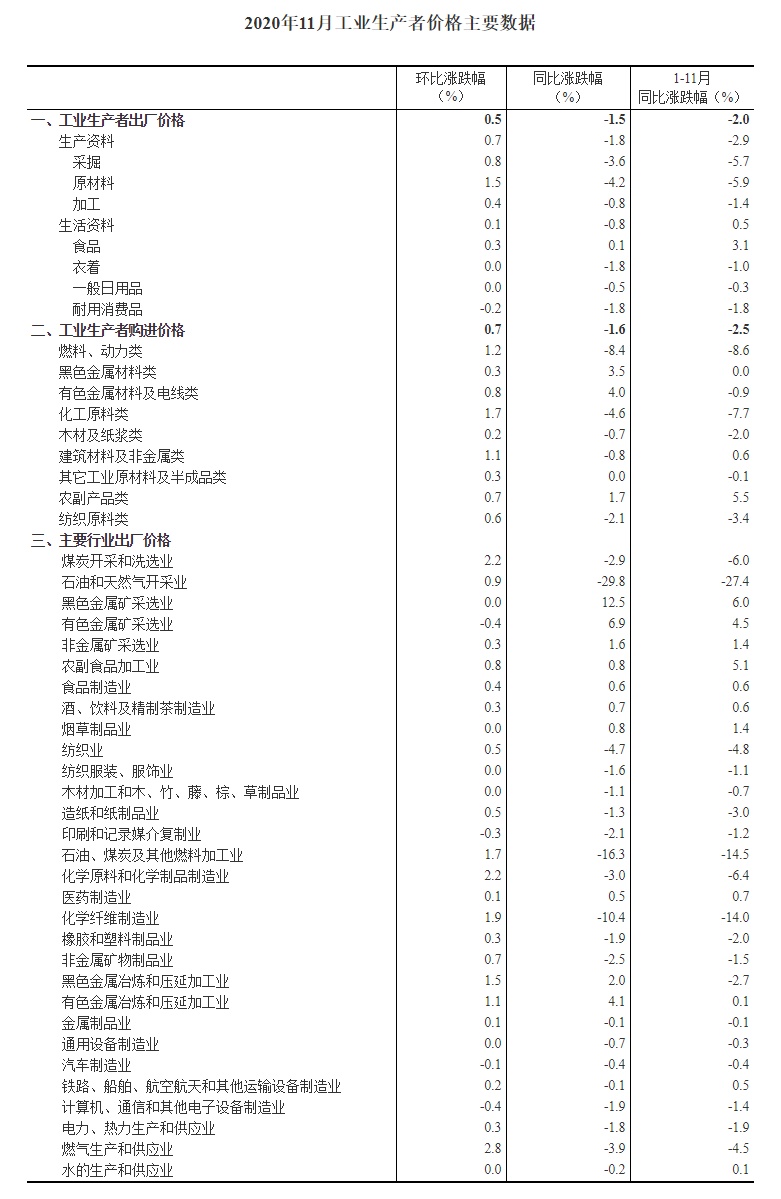 智通财经APP获悉,2020年11月份,全国工业生产者出厂价格同比下降1.5%,环比上涨0.5%;工业生产者购进价格同比下降1.6%,环比上涨0.7%。1―11月平均,工业生产者出厂价格比去年同期下降2.0%,工业生产者购进价格下降2.5%。