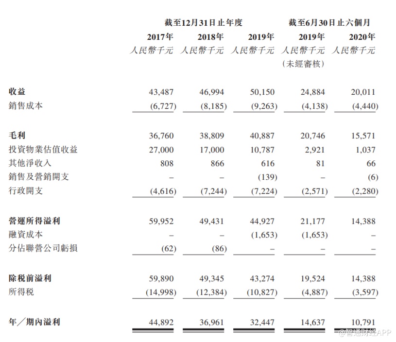 截至2017年至2019年度及2020年6月30日止六个月,公司的物业租赁业务收益分别约为4270万元、4590万元、4690万元及1890万元,分别占到公司总收益的约 98.2%、97.7%、93.6%及94.4%。