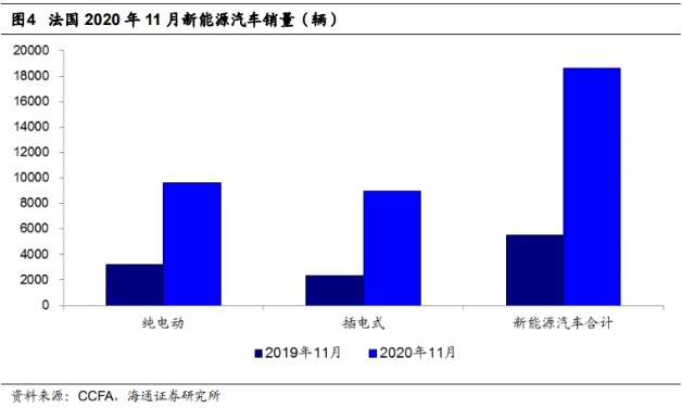 CCFA表示,1-11月法国新能源纯电动汽车合计销量9.02万辆,相比19年同期增长138%;20年1-11月法国插电式汽车合计销量5.95万辆,较19年同期增长266%。