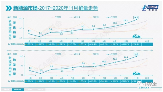 国内11月新能源汽车销售也延续高增长,乘联会数据显示,11月新能源车零售16.9万辆,同比增量9.7万辆,同比增速136.5%,乘用车零售市场渗透率8.0%,成为乘用车零售增长核心动力。