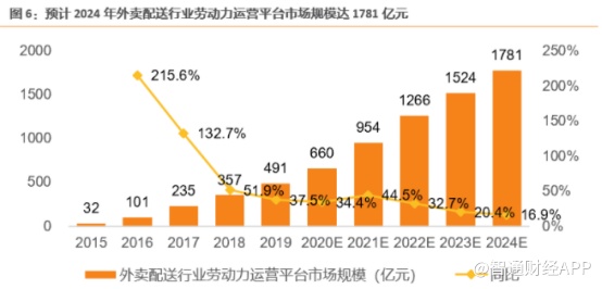 自2018年以来,部分外卖平台停止使用自建的配送团队,转而使用外包服务。而2019年外卖配送行业相对应的劳动力运营平台市场收入为491亿元,预计将按照29.4%的复合年增长率增长到2024年的1781亿元。