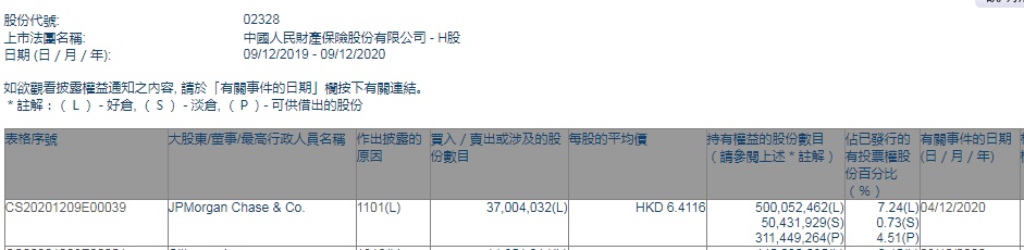 智通财经APP获悉,香港联交所最新资料显示,12月4日,摩根大通增持中国财险(02328)3700.4032万股,每股作价6.4116港元,总金额约为2.37亿港元,增持后最新持股数目约为5亿股,最新持股比例为7.24%。