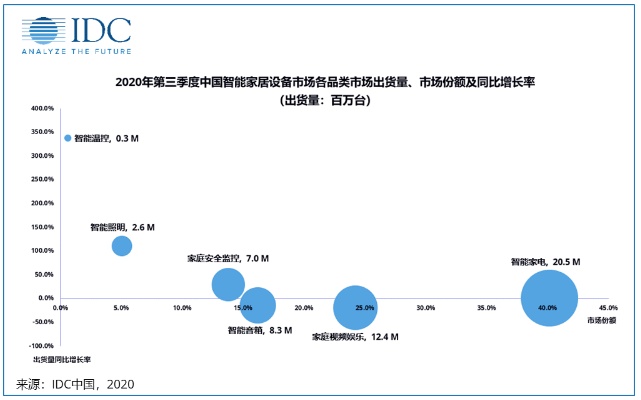 智通财经APP获悉,根据《IDC中国智能家居设备市场季度跟踪报告》显示,2020年第三季度中国智能家居设备市场出货量约5112万台,同比下降2.5%。市场下行主要受到智能音箱、家庭视频娱乐设备出货减少影响,第三季度智能音箱市场出货量约829万台,同比下降14.7%,家庭视频娱乐设备出货量约1238万台,同比下降19.9%。家庭安防监控、智能照明和智能温控市场均延续快速增长态势,第三季度出货量分别同比增长28.6%,110.5%,337.5%。