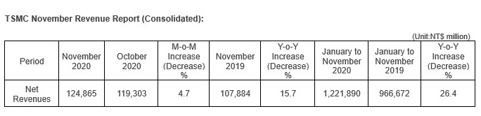 智通财经APP获悉,台积电(TSM.US)于12月10日公布了2020年11月的营收。数据显示,台积电11月营收1248.7亿新台币,同比增长15.7%,环比增长4.7%。2020年1-11月的营收为1.22万亿新台币,同比增长26.4%。