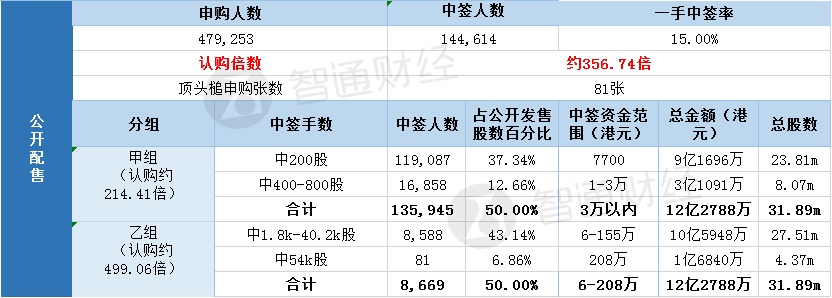 其中,公开配售申购人数479253人,一手中签率15%,认购倍数约356.74倍。