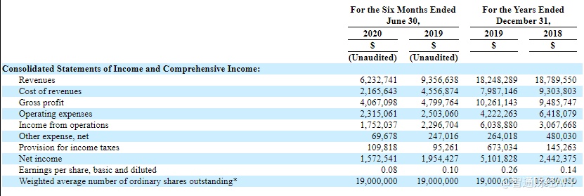 截至2020年6月30日的六个月里,公司营收为623万美元,净利润为157万美元,基本和摊薄每股收益为0.08美元。2019财年和2018财年营收分别为1825万美元、1879万美元,净利润分别为510万美元、244万美元。