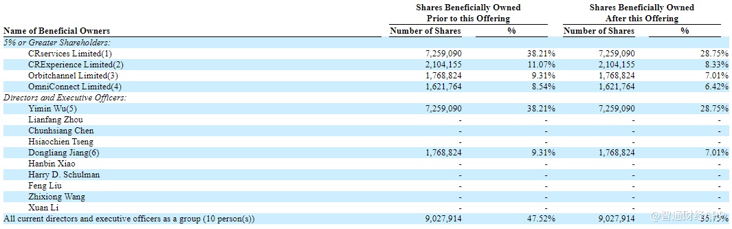 IPO前,讯鸟首席执行官兼董事长Yimin Wu通过CRservices Limited持有讯鸟38.21%股权。IPO后,Yimin Wu持股比例将为28.75%。