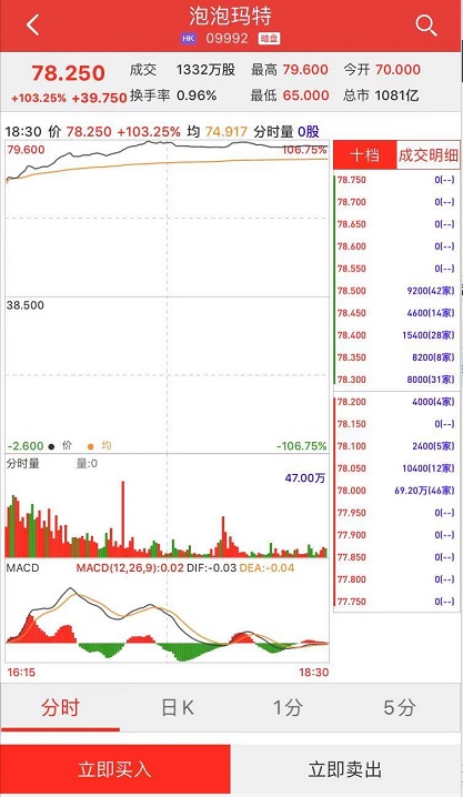 智通财经APP获悉,泡泡玛特(09992)将于12月11日(周五)在香港挂牌,截至暗盘收盘,利弗莫尔证券资料显示其暗盘报价78.25港元,较招股价38.5港元涨103.25%。每手200股,不计手续费,每手赚7950港元。