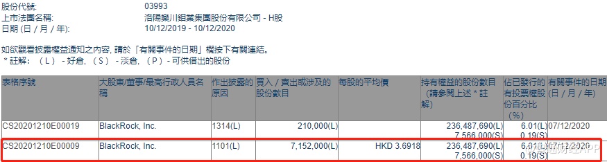 智通财经APP获悉,香港联交所最新资料显示,12月7日,贝莱德增持洛阳钼业(03993)715.2万股,每股作价3.6918港元,总金额约为2640.38万港元,增持后最新持股数目约为2.36亿股,最新持股比例为6.01%。