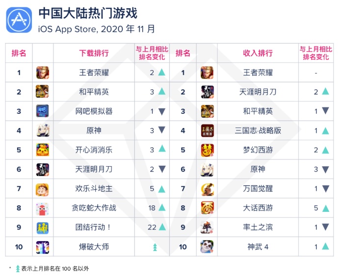 全球游戏收入榜单较上个月相比并无明显变化,刚刚获得 App Store 以及 Google Play 双榜年度最佳游戏的《原神》,稳坐收入排行榜第一。