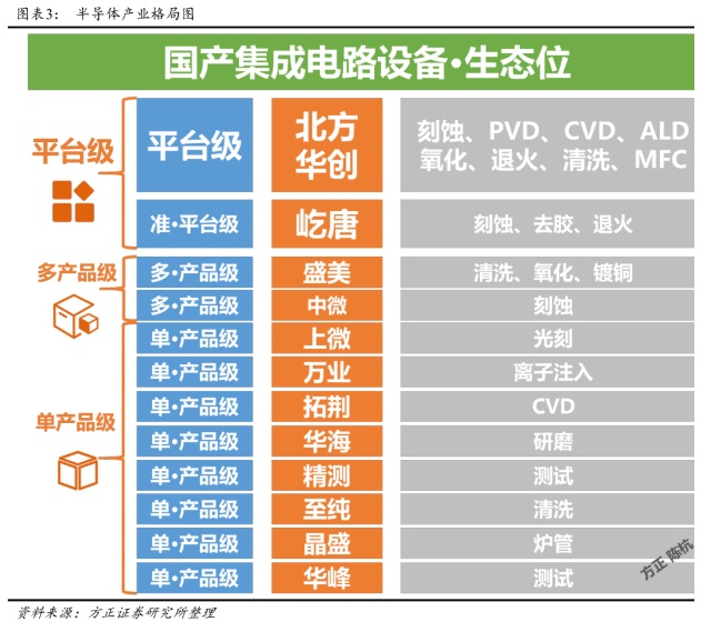 单产品级:沈阳拓荆(CVD)、万业企业(Imp)、华海清科(平坦)、中科飞测(量测)、中科信(Imp)、华峰测控(测试)、精测电子(量测)、至纯科技(清洗)