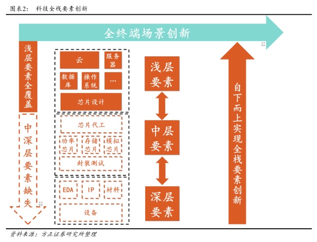 2.硬科技,要素创新:是科技发展的底层源动力,是一种纵向的探索式创新,从上往下依次划分为三个层级,分别是:浅层要素(云、系统软件、服务器、芯片设计)、中层要素(代工、封测、制造、存储)、深层要素(芯片设备、材料、IP、EDA),而这三层硬科技归根结底来源于数学、物理、化学、材料等基础科学。对于技术边界的拓展,这些基础设施背后的要素创新,自上而下,层次越深,难度越大,中国与国外的差距也越大。